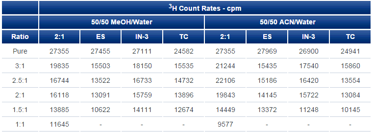 Table 1. Static Counting. ES (IN-FLOW ES), biodegradable scintillator solution for high levels of methanol and acetonitrile; IN-3 (IN-FLOW 3), for mildly buffered highly aqueous samples; TC (IN-FLOW TC), for high concentrations of ammonium phosphate and formate buffers.