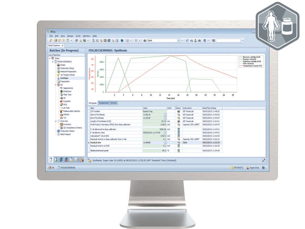 PETra verbindet sich mit allen führenden Zyklotronsystemen und integriert die Schlüsselinformationen direkt in das Chargenprotokoll. Strahlstrom, LOB, EOB, etc., – alles direkt transferiert in das Chargenprotokoll durch einen Knopfdruck.