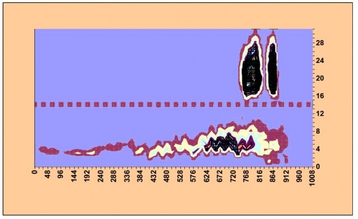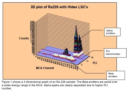 La figure 1 montre un graphique tridimensionnel d'un échantillon de Ra-226. Les émetteurs Beta sont diffusés sur une gamme d'énergie plus large dans le AMC. Les pics Alpha sont clairement séparés en raison d'un nombre de PLI plus élevé.