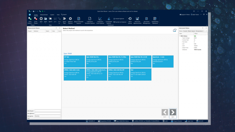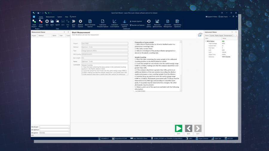 Thanks to Laura Radiopharma’s quick start wizard, radiopharmaceutical QC has never been quicker. This smart feature allows users to run measurements in just two clicks of a mouse through an intuitive User Interface.